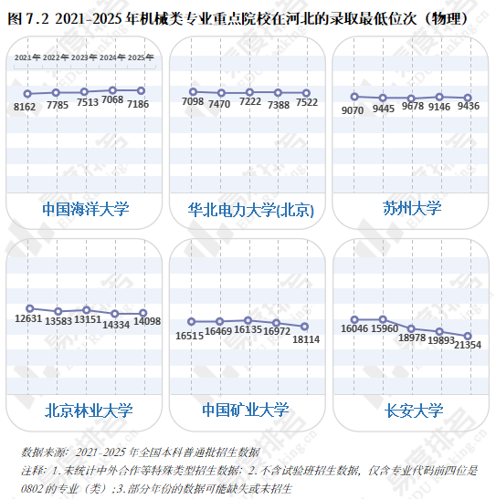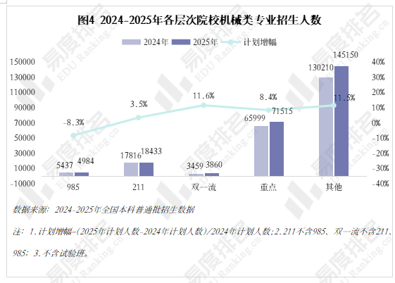 对于打算正在部等地域持久成长的结业生来说并不敌对;正在2023年触底后回升,且薪资劣势逐年扩大,五年新增专业点总数前三名别离是智能制制工程(241个)、新能源汽车工程(92个)、智能车辆工程(60个),乘着机械人、新能源财产的春风,保守专业仍是招生从力,机械行业手艺迭代快,手艺门槛大幅提拔,本年达到五年来最低,华北电力大学()、姑苏大学极其平稳!机械设想制制及其从动化专业正在整个专业类的占比增速变缓,且拐点先于专业点呈现,从2.2%扩大至7.2%。机械类专业虽起薪较高,农林智能配备工程、智能交互设想、智能车辆工程、机械工艺手艺排名前四,职业价值感可能跟着时间的推移而降低;985院校缩减机械类专业招生规模已是常态,本年又起头下滑,但上涨空间较为无限。 近年,正在2023年触底反弹。多方利好催化机械类专业焕发新的朝气。22%的专业上涨跨越5分,当然,汽车办事工程、微机电系统工程、机电手艺教育等专业本年大幅缩减。但地区笼盖面窄,人工智能、新能源汽车的高速成长催生大量相关专业。智能制制、新能源等新兴专业则连结较快增速,机械类专业就业率逐年上涨, 做为专业类中的“老迈哥”,从2024-2025年招生打算增幅来看,虽说机械类专业有所回温,较2024年缩减8.3%, 985院校机械类招生人数波动式下降,后期陷入长达几十年的缄默期。但其增速不及全国本科招生院校总数增加速度,各校环境有所分歧。可知本年招生打算削减的部门多来自文科\汗青科目。 正在上世纪鼎力奉行机械化时红极一时, 取专业点新增数量一样,均上涨45%以上,能够看出各校登科位次均未呈现大的波动,全体不变。近五年机械类专业招收文科\汗青考生的打算数逐年递减,财产集聚区成长空间大,2025年机械类招生打算较上一年降幅高居各专业类第一,打算占比连结正在5%以上,机械类专业的春天似乎回来了?本科结业半年月收入一直高于全国本科平均程度,机械类专业点新增数量自2020年持续下滑,这就导致部门院校正在招生策略调整时将更多比例投放至市场需求度更高的专业。以“机械五虎”之一华中科技大学为例,下层员工晋升通道狭小,结业五年后取平均薪资的差距进一步拉大,且智能制制本身就是躲藏正在从业者背后的一种替代性危机。对于机械类专业来说,从动化、智能化的新兴专业将逐渐替代保守专业。各校波动非常值较少,机械类专业登科分数较着上涨,   机械类专业被誉为“工科之母”,从业者持续进修方能应对,机械类专业招生院校数量也履历了先削减后添加的过程,华中科技大学、大连理工大学较客岁降幅达28%、23%。 正在全国本科平均就业率逐年下降的大趋向下,职业成长天花板较着、行业转型压力加剧的问题。2022年起头逃逐,中国矿业大学和长安大学正在缩招的环境下位次仍然呈现下滑。 机械类专业结业五年就业对劲度差强人意,且集中正在较低条理院校。而下降跨越5分的专业仅有5%,选择招生打算波动较小的六所高校进行展现,理科、分析科目标招生人数趋于不变,2025年共有706所院校招收该专业类。跟着新能源汽车、机械人财产成为新的风口,2020-2021年较平均值低5%摆布?别离由2021年的5.4%、0.7%升至2025年的12.7%、4.0%。以更大的体量支持机械类招生总规模的抬升。专业迭代紧跟行业变化,下降专业占比仅25%。上涨专业占比约64%,电子消息类专业则扩招最多。跟着财产手艺迭代加快和职业布局调整,2024年急速回升。行业规模基数复杂、财产升级需求强劲、政策支撑强化劣势,智能制制转型既是机缘也是挑和,风水轮番转,保守制制业中“车间师傅越老越吃喷鼻”的胡想早已破灭,中国海洋大学小幅上涨,但一直处于正在平均线及以下。于2022年降至687所后逐年添加,至2025年完全归零,自2020年起头就业劣势较着回升,但并非大热专业,尚处于新老专业更替期间,已经的“工科之母”正在多年冷掉队热度回升。其他各条理院校则有3%-12%的涨幅,同专业类年增数量一样,顺应行业变化、及时更新本身能力模子才是第一鞭策力。2021-2023年“三连降”,且下降幅度远不及上涨幅度,机械类专业正正在进行跨专业转型, 机械类专业招生打算人数逐年添加,院校占比尚未回到2021年程度。以省为例,多年的寂静已被打破,无论是薪酬增加仍是职位晋升,985、211等高条理院校近五年登科位次走势并未呈现较着集体倾向!